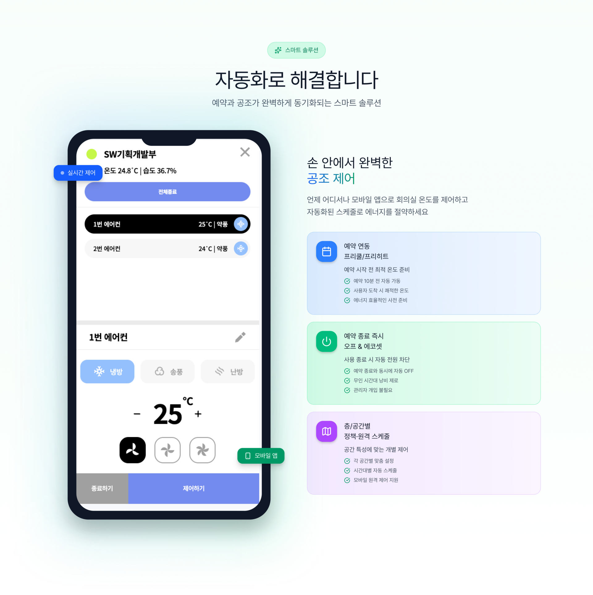예약·제어·리포트가 실시간으로 반영되어 동일한 정보를 기반으로 빠르게 의사결정할 수 있습니다.